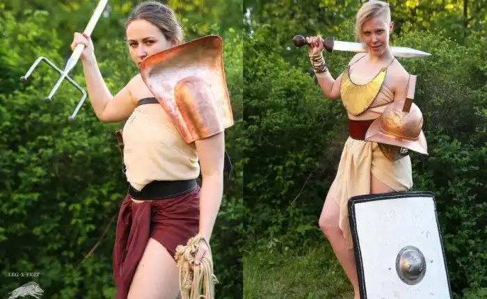 Гладиаторки на самом деле часто были полуобнаженными. Выходили на арену топлес в одних штанах. Иногда надевали ремни крест-накрест.