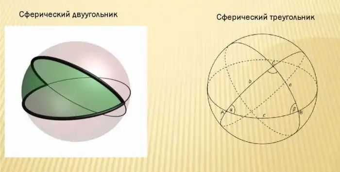 А ещё в сферической геометрии существует геометрическая фигура «двухугольник» . Это замкнутая фигура, которая образована двумя пересекающимися отрезками прямых и двумя углами между этими прямыми.