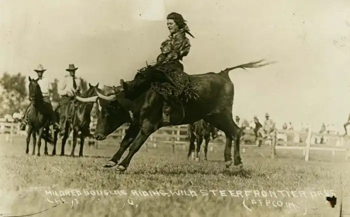 Милдред Дуглас верхом на диком быке, Шайенн, Вайоминг, 1917 год