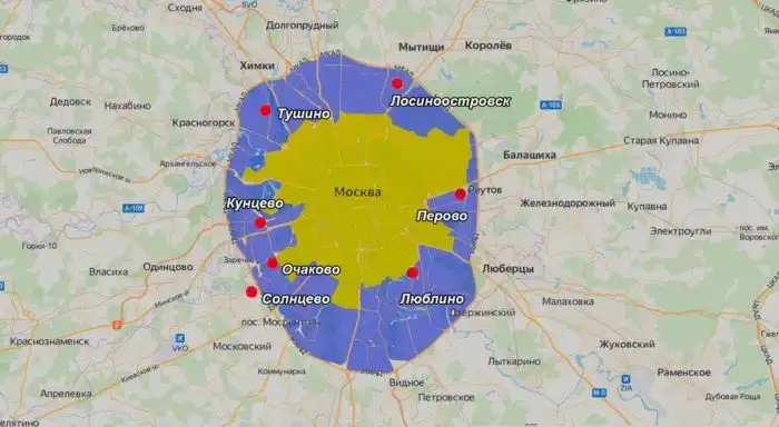 Жёлтым – Москва до 1960-ых. Синим – территории Москвы в пределах МКАДа. Красным отмечены местоположения поглощённых городов