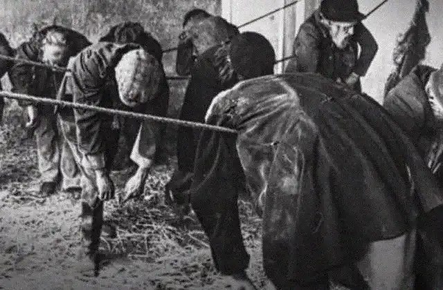 Фото сделано в Лондоне в 1920–1930-е годы, и на нем изображены люди, в карманах которых нашлось лишь по два пенса на ночлежку. Именно столько требовалось заплатить за возможность поспать, повиснув на веревке. Сейчас такая поза покажется издевательством, но в то время считали иначе.