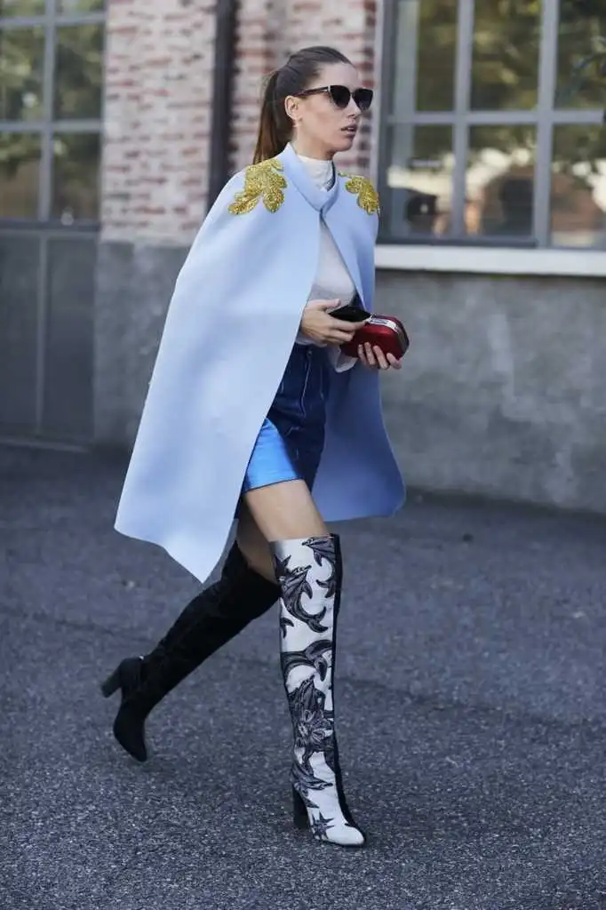 Кейп очень часто появляется на неделях моды и сейчас как никогда популярен в европейских странах. В 2021 подобные облегченные пальто выделяются нестандартными деталями, к примеру, нашивкой будто из обмундирования гусар. Кейп - это отличный вариант для холодного лета или же тёплой весны. Все известные дизайнеры обувают ботфорты к такой верхней одежде.