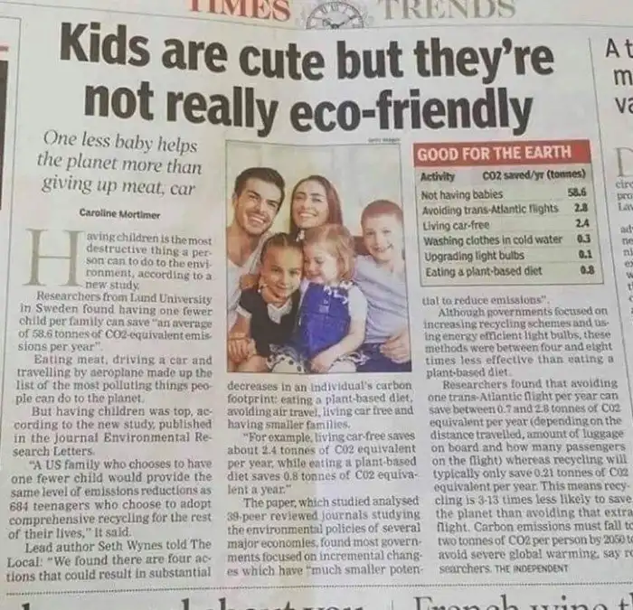 Ученые из Лундского унивеситета (Швеция) открыли, что отказ от одного ребёнка в семье позволяет «сократить выбросы углекислого газа по меньшей мере на 58.6 тонн в год».