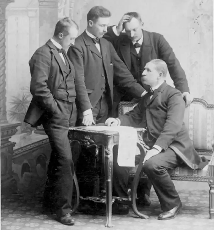 Слева направо Густав Вильхем Эмануэль Сведенборг; Нильс Стриндберг; Кнут Хьякмар Фердинанд Френкель; Саломон Август Андре (сидит)