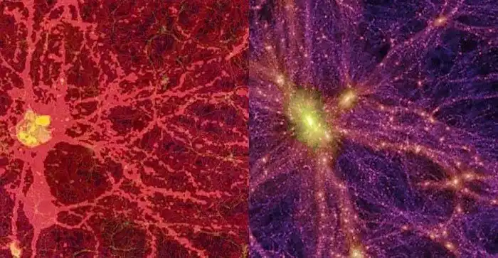 Клетка мозга (слева) и масштабированная структура вселенной (справа)