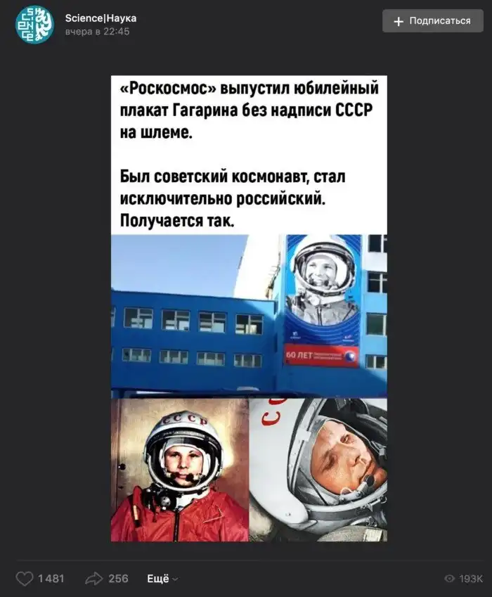 Изначально на шлеме Гагарина не было надписи СССР, ее дописали позже