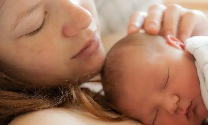 Когда воздействие успокаивающего эффекта окситоцина начинает действовать мама и малыш наконец-то засыпают, чтобы отдохнуть после родов.