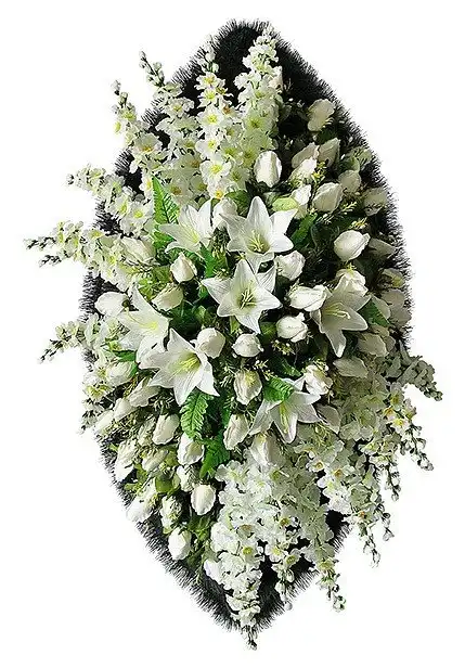 Светлый и воздушный венок из лилий с вкраплением белой розы и утонченного дельфиниума, как и предыдущая модель имеет подложку с имитацией под хвою. Данная модель выполнена из искусственных цветов длинною 110-см. Подойдет как для масштабной прощания с усопшим, так и для скромного траура.