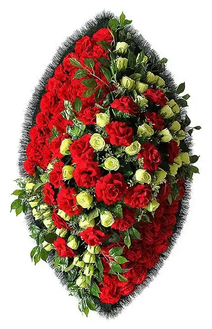 Объемная модель из роз в двух цветовых палитрах (белый, красный) с вкраплением гвоздик - хороший способ высказать своё уважение и скорбь усопшему. Композиция состоит полностью из искусственных цветов длинною 110-см. Выполнен в заостренной форме, что позволит устанавливать венок в горизонтальной позиции.
