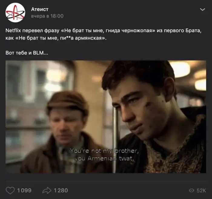 Фразу перевели как «Не брат ты мне, глист черножопый» (You're not my brother, you black ass worm).