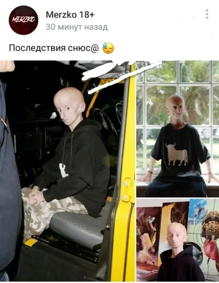 Это художник и музыкант Леон Бота и у него редкая болезнь прогерия и никакого снюса