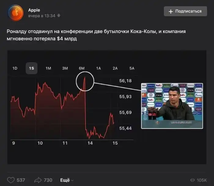 Новости о поступке Роналду вышли позже, чем падение акций. Может потому он убрал бутылочки?