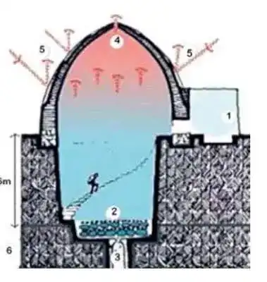Еще один способ - замерзание воды в самом ячхале. Вода находится в подземной части ячхала. А из-за конической формы, тепло уходит наверх и уходит через отверстие. В ячхале же остается холоднее чем снаружи.
