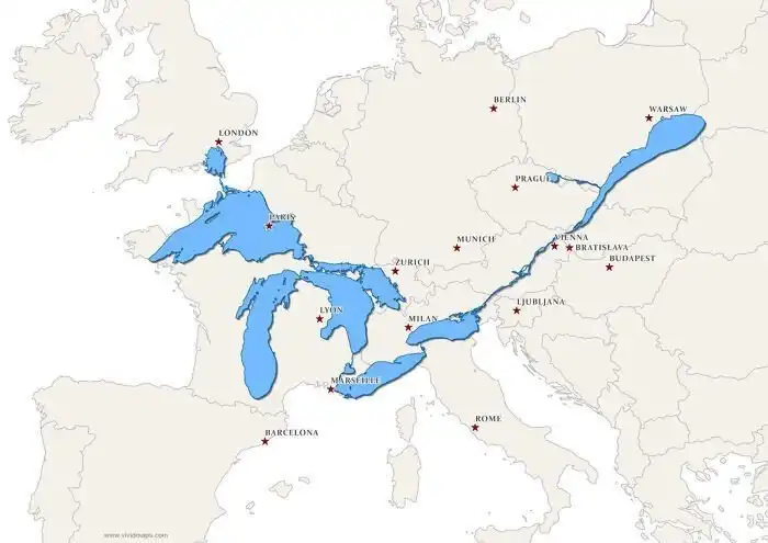 Так выглядели бы Великие озера и река Сен-Лоран на карте Европы