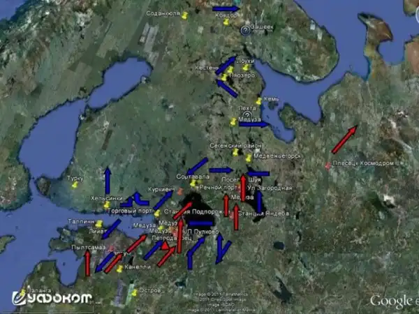 Объект с большой скоростью улетал на северо-запад. В поселке Кестеньга (Карелия) на северо-востоке с 01 ч. 10 мин. до 04 час. 20 мин. было замечено движение двух тел в форме круга белого цвета с угловыми размерами с Луну.