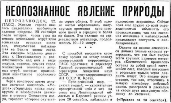 Одним из таких событий, несмотмненно, является события проходящие в Петрозаводске. Там была целая цепь разных обстоятельств, произошедших в период с сентября 1977 года по февраль 1978 года. Но пик вссего был около 4 часов 20 сентября 1977 года , когда над Петрозаводском зависло огромное светящееся тело со световыми струями, исходящими из яркого объекта в темном ночном небе.
