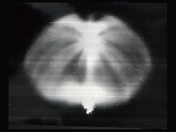 Затем постепенно развилась структура, состоящая из изогнутых «лучей», соприкасающихся в центральном теле. Возможно, они представляли собой потоки светящегося вещества. Эти струи занимали собой значительную область неба. Весь объект по форме напоминал «медузу». Основной цвет «медузы» был бело-голубым, а центральный объект светился красным цветом.