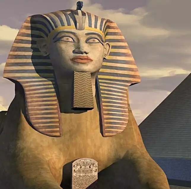 Сфинкс ушел в песок по самые плечи уже в Древнем Египте. Рамзес II откапывал древнюю статую, а римляне и греки пытались укрепить ее, защитив от эрозии. Кроме носа с веками Сфинкс лишился и своей прекрасной бороды. К тому же, статуя была раскрашена. Примерно так мог выглядеть Большой Сфинкс несколько тысяч лет назад: