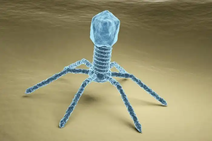 Это бактериофаг. Это вирус, который совершенно безвреден для человека, но заражает и уничтожает бактерии.