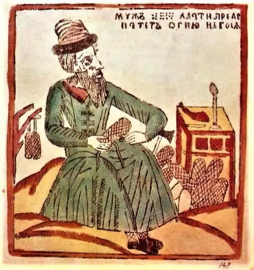 Мужик, плетущий лапти. Лубочная картинка XVIII века
