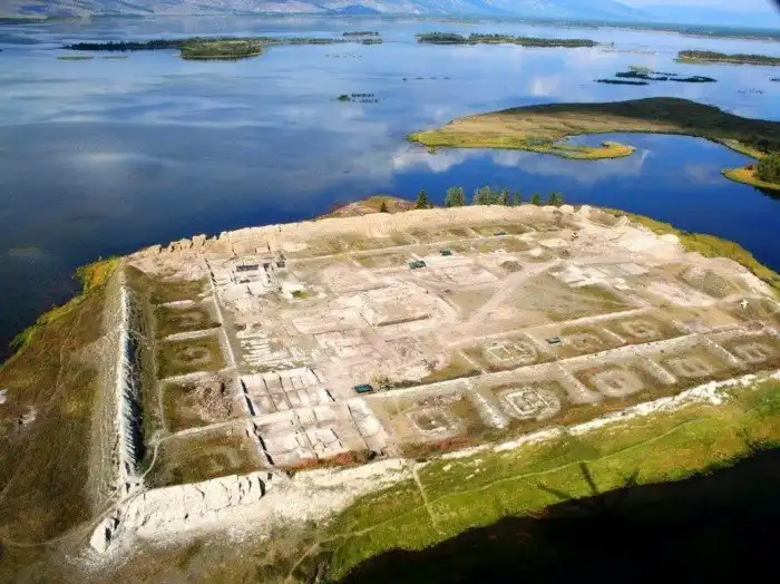 Это остатки укрепленного поселения, который был построен на небольшом острове в озере Тере-Холь, расположенном на юге Сибири. За крепостной стеной – здания из сырцового кирпича.