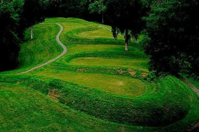 Курган высотой один метр в форме змеи. И растянулся на 440 метров в длину. Создан был местными индейцами, представителями так называемой культуры Форт-Эйншент. Они любили вычурные земляные сооружения.