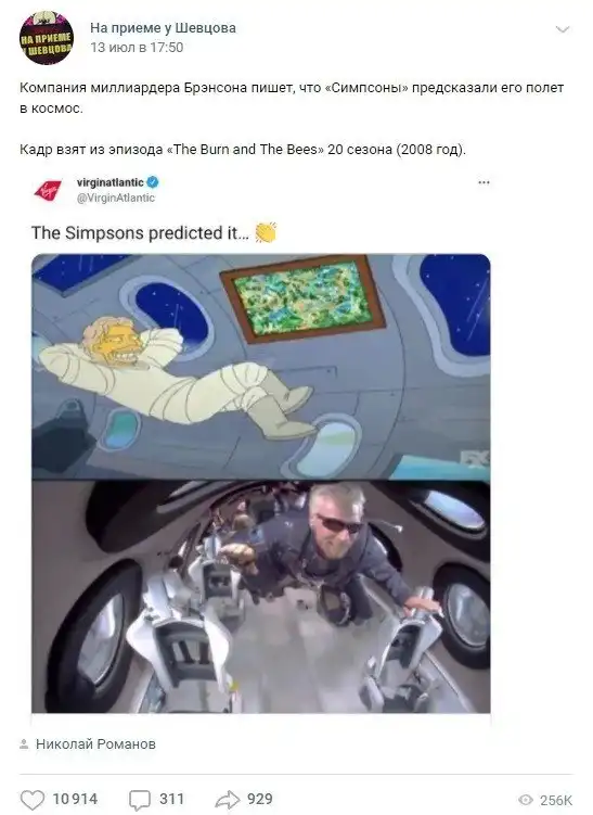 Секундный момент с Ричардом Брэнсоном в космосе есть, но в 15 серии 25 сезона (2014 год) -именно в этом году миллиардер "пробовал" невесомость в земнызх условиях. Однако он неоднокртано заявлял, что полетит в космос, так что предугадать несложно.