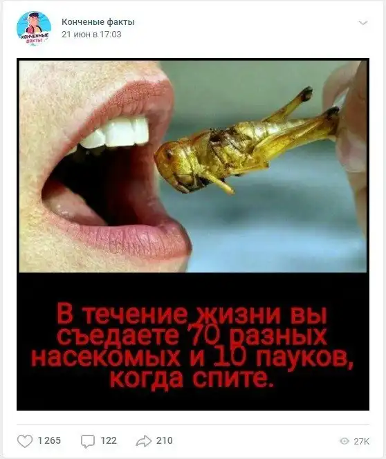 Миф основан на исследования британского психолога снов, в которых людям снилось, что они ели пауков. Данный сон означает, что человек проходит стадию обновления, переходит на новый уровень духовного развития, а съеденные пауки - это решение проблемы, избавление от страхов, неувернности. Насекомые и пауки действительно могут залезать в ротовую полость и оставлять там яйца, но для этого должно выполняться очень важное условие — человек должен быть мёртв.