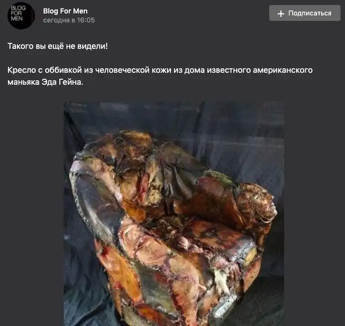 Эд Гин, маньяк, правда делал кое-какие вещи из человеческой кожи, но это не его работа. Кресло сделано из винила.
