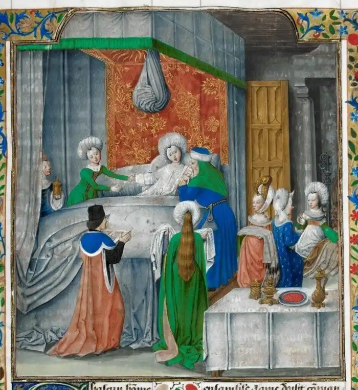 В средние века женщины высших классов общества закрывались в специальной комнате за несколько дней до родов. К ним пускали только женщин, а также тщательно закрывали окна шторами, чтобы свет не повредил глаза будущей матери