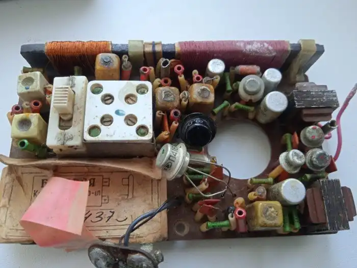 Я было обрадовался, что достался пред серийный образец 66 года, но оказалось в моем приемнике детали с 66 по 68 год изготовления. Кожаный чехол в отличном состоянии, чего не скажешь про сам радиоприемник. Выломана ручка настройки, нет динамика и крышки батарейного отсека. Приемник два раза прошел ремонт в середине 70х годов и в после 80 года .