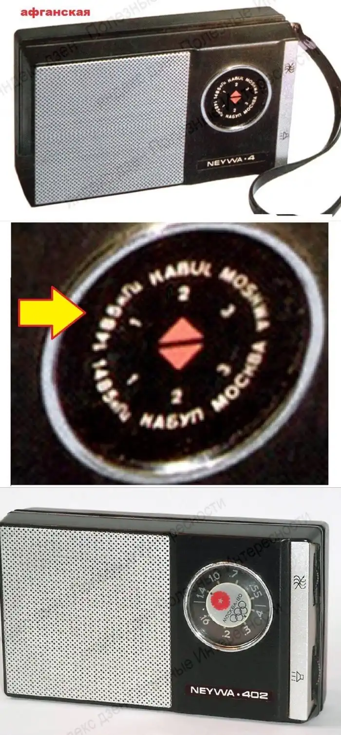 с 1976 года начинается выпуск специальной модели для Афганистана. "Neywa-4" для шурави был сделан на базе модели "Нейва 402". Из схемы убрали диапазон ДВ. На шкале отметили частоту 1485 килогерц, где исламское радио ежедневно передавало обязательные для мусульман молитвы