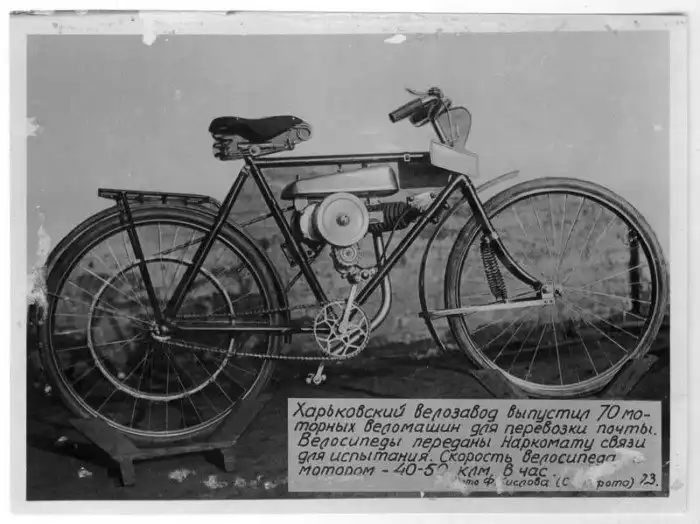 На фоне этой несуразицы появляется интересная модель харьковского велосипедного завода с двигателем, созданным сельским плотником Филиппом Александровичем Прибылой.