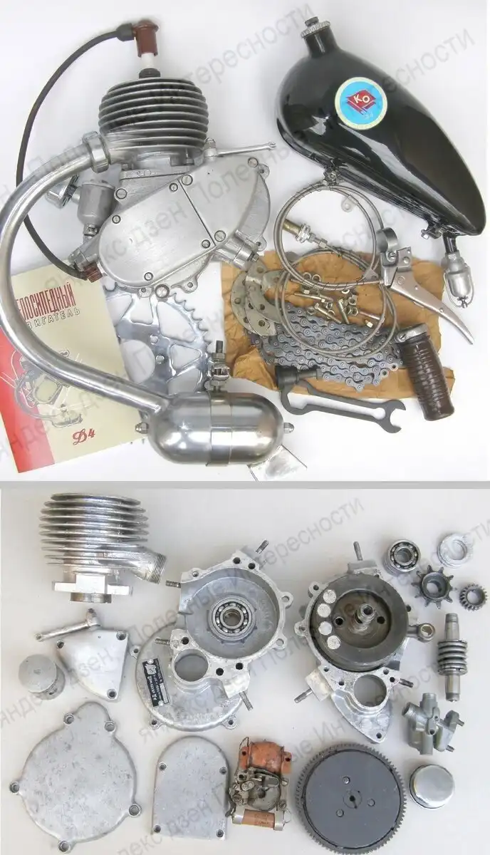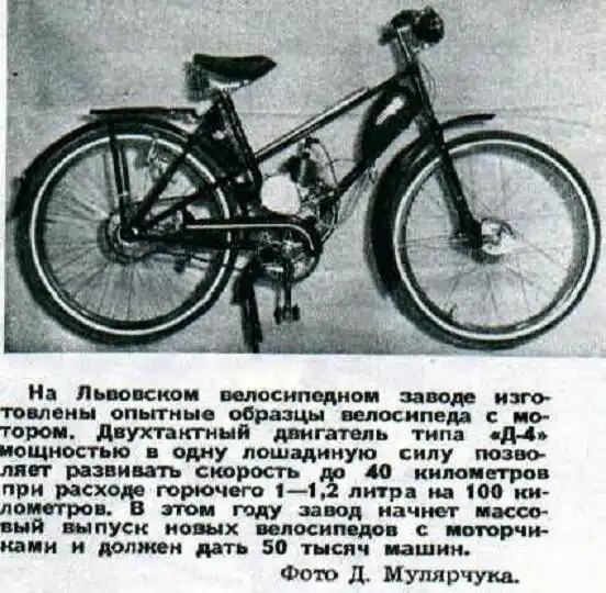 В 1955 году завод выпустил опытную партию из 300 велосипедов с моторами "Д-4". Двигатель имел степень сжатия 5,2 единицы, работал на бензине А-56, А-66 и развивал мощность в одну лошадиную силу и расходовал всего 1,2 литра бензина на 100 км.