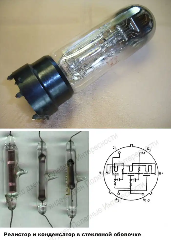 и объединил в одной колбе все три лампы, два конденсатора и три резистора. Получилась такая ламповая "интегральная схема"