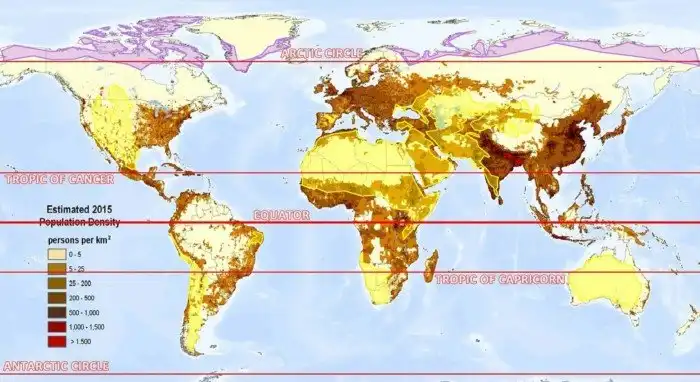 Давайте совместим на одной карте природные зоны и плотность населения. На этой карте экватор помечен толстой красной линией.