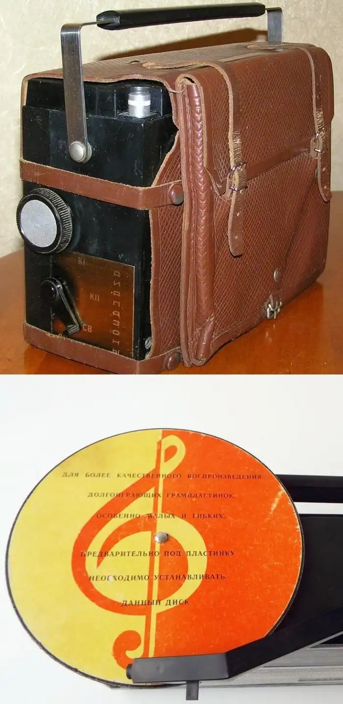 Я долго не мог понять: как с таким маленьким диском удается обеспечивать равномерную скорость вращения? К радиоле прилагался кожаный чехол с сумочкой. В этой сумочке был специальный диск-подставка диаметром 174 мм, и толщиной 2 мм. Его рекомендовалось подкладывать под грампластинку. Веса диска в 370 грамм вполне хватало для обеспечения равномерного вращения на всех скоростях.