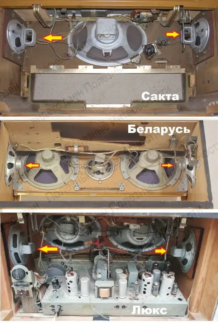 Ну и немалую лепту в восприятие звука вносит популярная в те года схема создания пространственного звучания: в сторону слушателя направлен центральный широкополосный динамик, а два динамика по боковым стенкам воспроизводят только высокочастотную (ВЧ) составляющую звука. Звук всех трех динамиков до слушателя доходит с различным сдвигом по времени, за счет этого получается пространственное звучание моно звука.