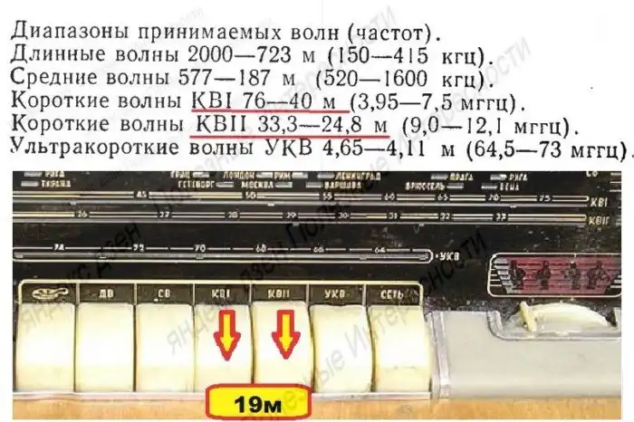 Если одновременно нажать две клавиши КВ1 и КВ2, то радиоприемник переключался на диапазон 19 метров, где вещание заокеанских "Голосов" не глушили передатчики КГБ.