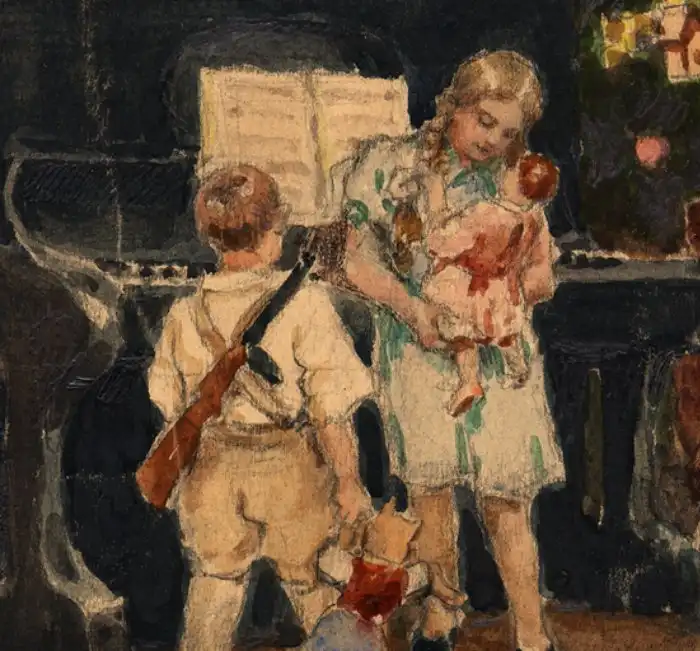 Какие ещё будут версии? Подделка? А зачем? Путешествие во времени? А на чём? Всемогущий и всё всегда объясняющий "фотошоп"? Вряд ли... Мысленно "сотрите" автомат, – спина мальчика останется пустым активным пятном, "конфликтующим" с раскрытыми нотами на пианино. Нет, художник бы так не сделал.