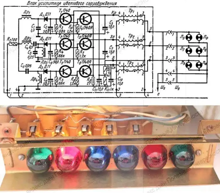 Все было прекрасно, кроме размера экрана-уж больно он маленький. Так же выпускалась радиола модели "Бирюза", где экраном служила крышка проигрывателя, но этого все равно было мало. Для подключения дополнительных лампочек нужны были более мощные транзисторы. Советская промышленность выпускала мощные транзисторы П4, но достать их радиолюбителям было очень сложно