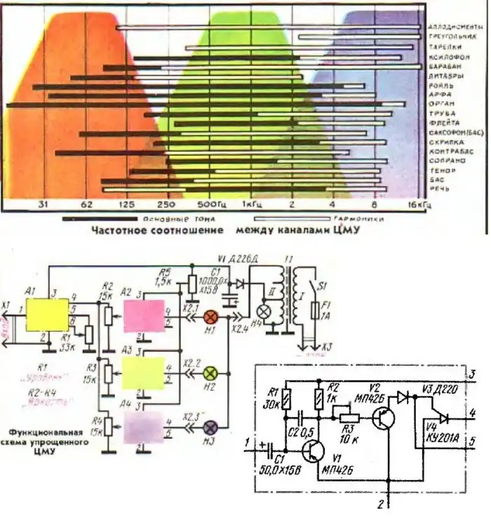 Первую цветомузыку на тиристорах КУ201А разработал инженер Бердичевский в 1975 году. Весь музыкальный спектр разделялся на три канала. Максимально разрешенное напряжение тиристоров КУ201А всего 25 вольт, поэтому для электропитания понадобился мощный понижающий трансформатор.