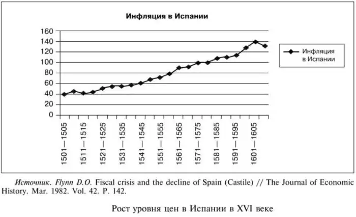 Доходы Испанской Империи год от года росли, ведь из колоний завозилось не только драгоценные металлы, но и другие ценные товары. Однако обилие золота принесло с собой и такую вещь как "инфляция", денег стало так много, что стало не хватать товаров. В те времена цены не менялись десятками лет, налоги платились в абсолютных величинах. Вот только каждый уплаченный в виде налога песо теперь стоил меньше. Формально казна государства не уменьшалась, зато деньги стремительно дешевели. Появилась поговорка: «В Испании дорого все, кроме золота».