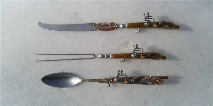 Были и необычные гибридные пистолеты, позволявшие стрелять столовыми приборами. Владелец такого оружия мог попытаться отразить нападение, не отрываясь от приема пищи.