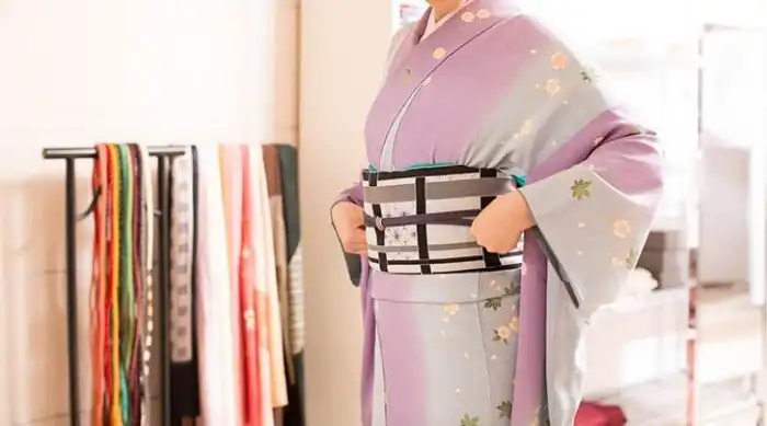Талия оборачивается поясом - оби, который сложно завязывается на спине.