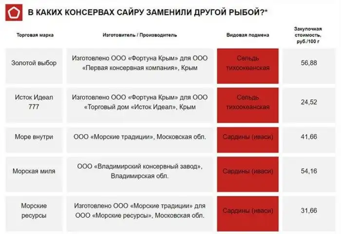Из 19 образцов, взятых Роскачеством на экспертизу, лишь в восьми (42 %) оказалась действительно сайра. Это консервы торговых марок «5 морей», «Азбука моря», «Владимирский консервный завод», «Доброфлот», «Капитан Вкусов», «КитБай», «Мамоновский рыбоконсервный комбинат» и «Примрыбснаб». Самыми дешёвыми нефальсифицированными консервами с настоящей сайрой оказались «КитБай» из Калиниградской области (44,4 рубля за 100 граммов), самими дорогими – «Доброфлот» из Приморского края (97,27 рубля за 100 граммов).