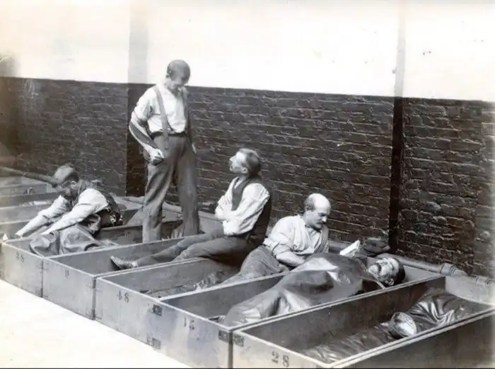 За один пенни - можно сидеть на лавке этой ночлежки. Но спать нельзя. Никаких укладываний на полу - охранники следят. За четыре пенни - можно и поспать. В очень удобном и комфортном ящике, укрывшись брезентом. Обитатели ночлежек мгновенно назвали эти ложе гробами.