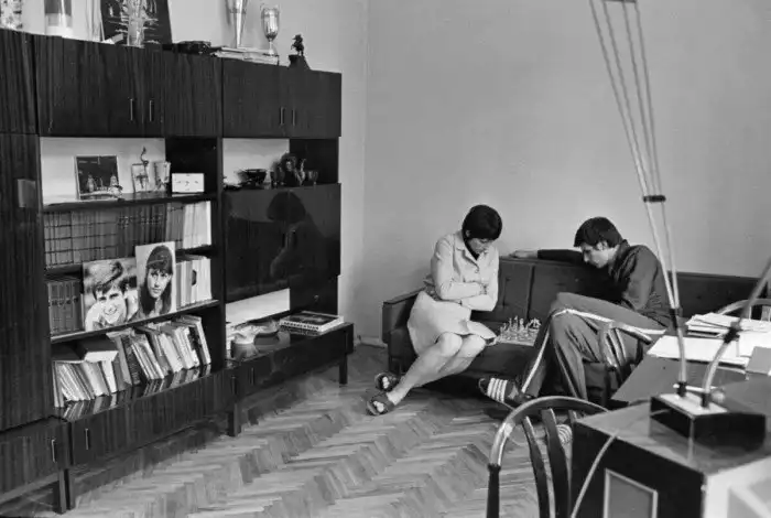 Семейная пара играет в шахматы в гостиной типовой квартиры, 1973