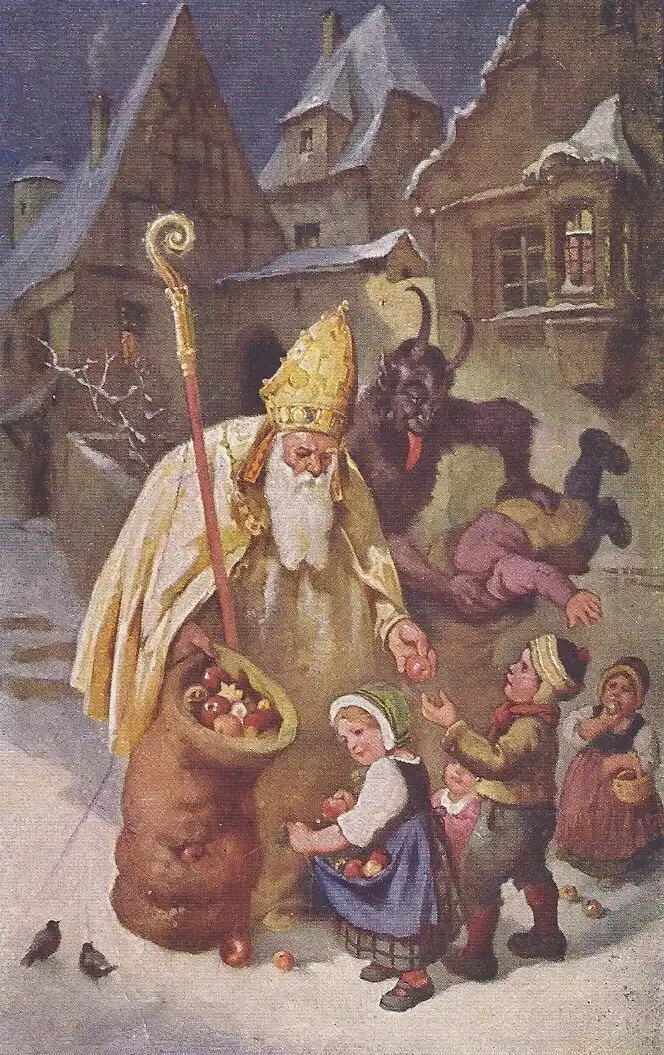 Обратите внимание: не зря Мартин Лютер не ждал добра от этих народных культов святых! Полюбуйтесь: за спиной у Николая в епископском облачении – нечисть Крампус, получёрт-полукозёл, запихивающий в мешок непослушных детишек! Ай-яй-яй. Хотя детишкам, конечно, весело.