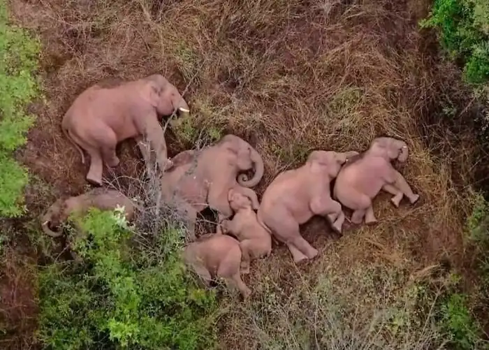 12. Дрон запечатлел с высоты спящую семью слонов.